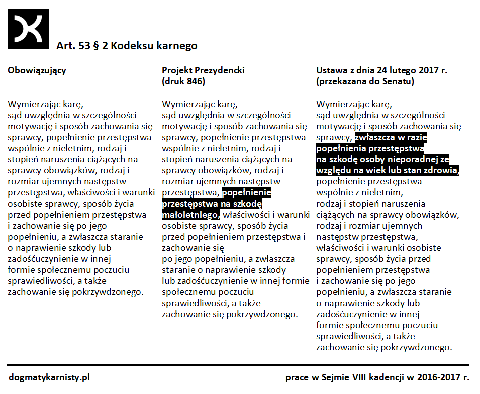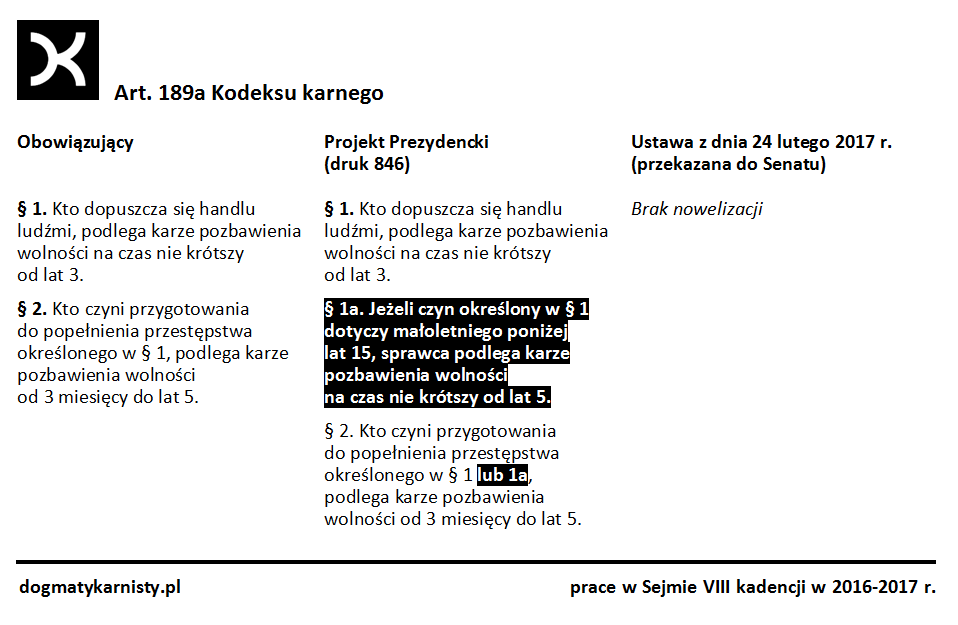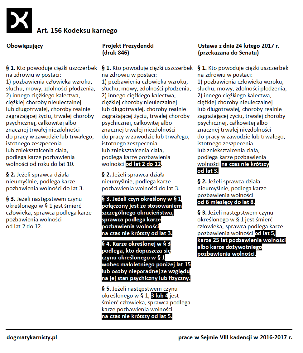 Zestawiłem obowiązujące przepisy Kodeksu karnego z propozycjami zawartymi w pierwotnym projekcie prezydenckim (druk nr 846), a także z treścią ustawy uchwalonej 24 lutego 2017 r. i skierowanej do Senatu (zobacz treść ustawy i przebieg prac legislacyjnych). Nowości względem aktualnego stanu prawnego zostały podkreślone na czarno. Grafiki można powiększyć. Mam nadzieję, że zestawienie okaże się przydatne.
